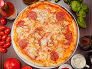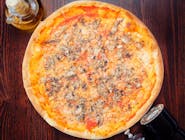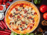 sos pomidorowy, salami, ser mozzarella na pizzy zasmażany -