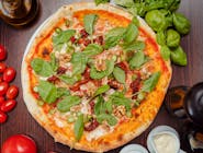 Sos pomidorowy, ser mozzarella, rukola, gruszka, gorgonzola, orzechy włoskie
